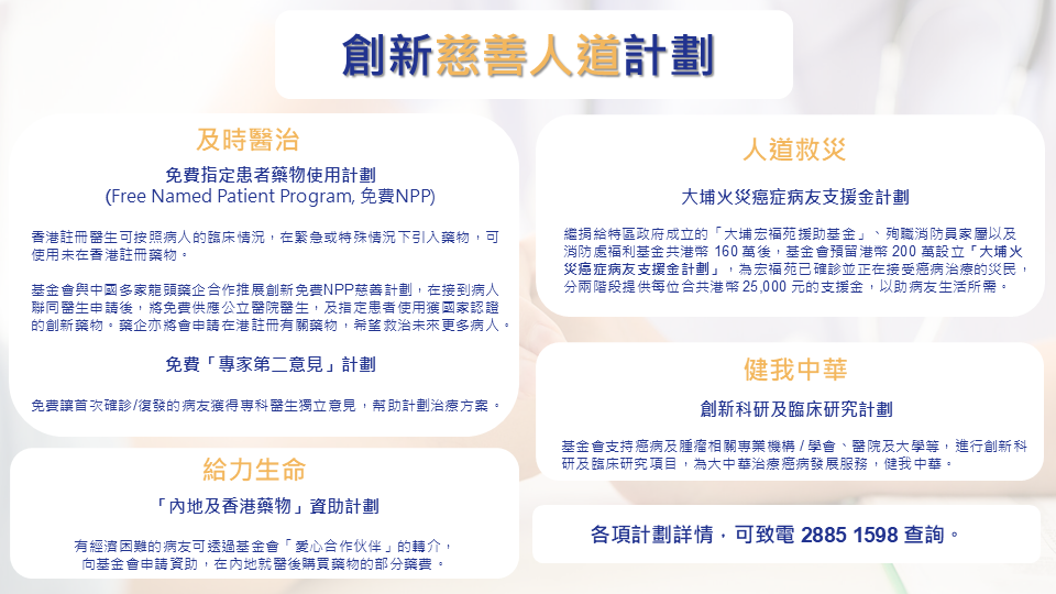 健我中華:透過中、港跨境協作,協助促成更多內地創新治癌藥物來港註冊;支持創新科研及臨床研究,服務中華民族的癌病醫療發展