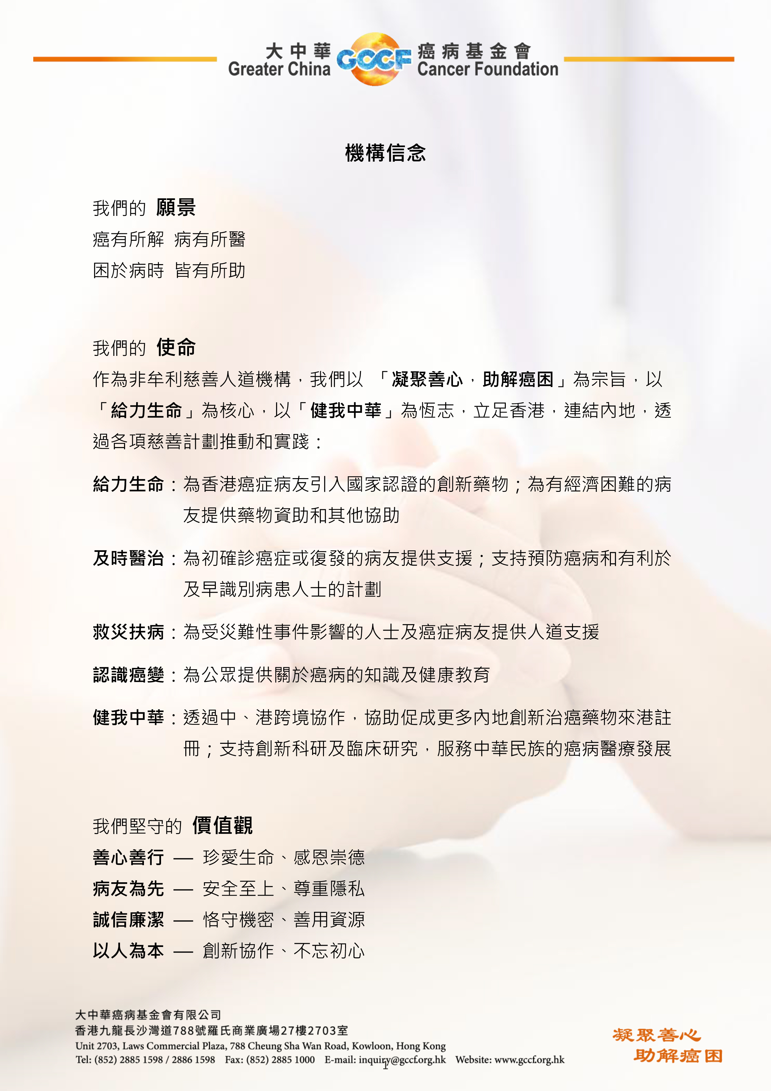 大中華癌病基金會(「基金會」)在2026年3月31日發表更新後的「機構信念 — 願景、使命、價值觀」,讓善長、持份者及公眾更清晰基金會作為慈善人道機構,推展各項創新慈善計劃所持守的信念及宗旨。