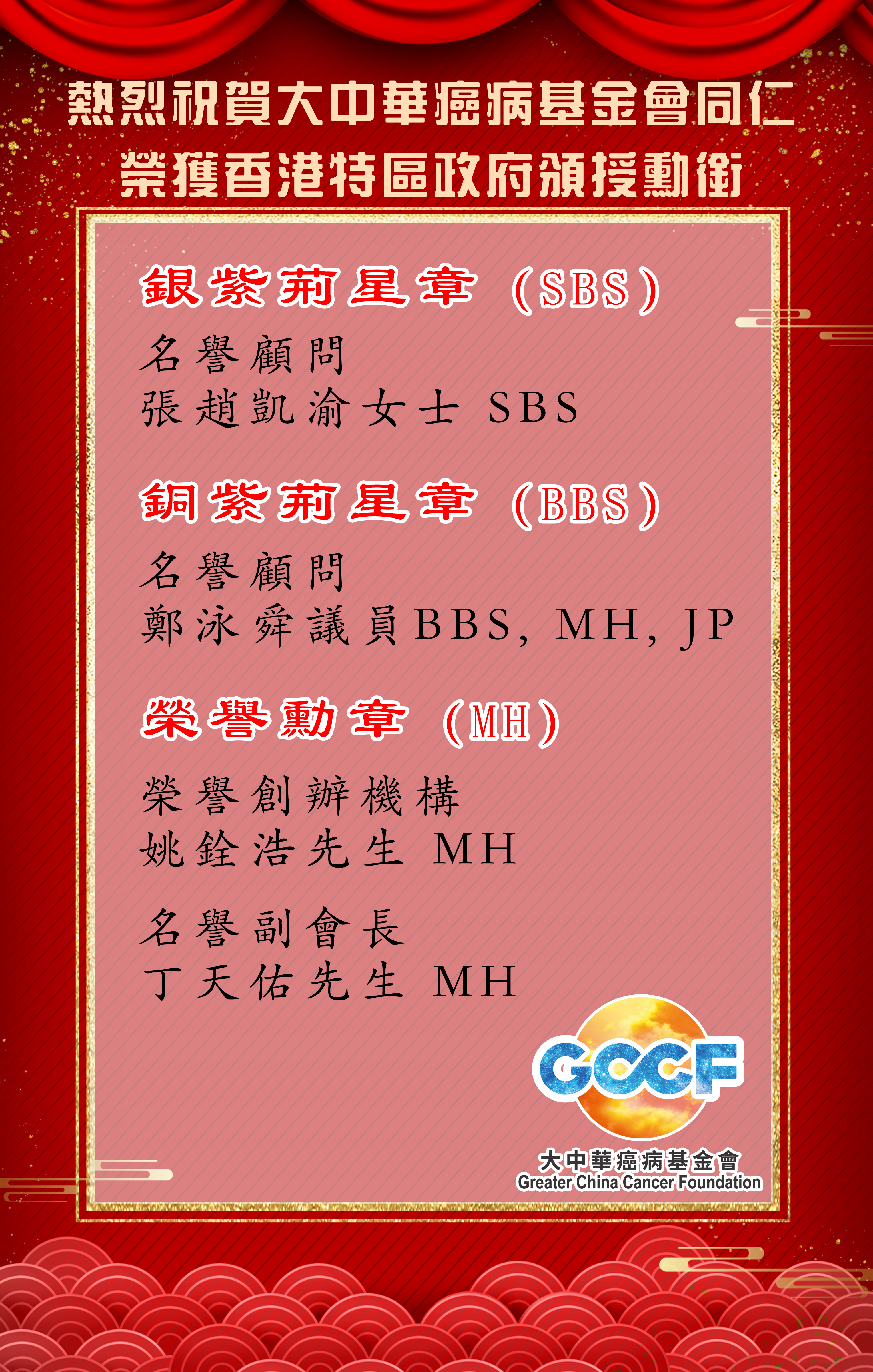 熱烈祝賀大中華癌病基金會同仁榮獲香港特區政府頒授勳銜
