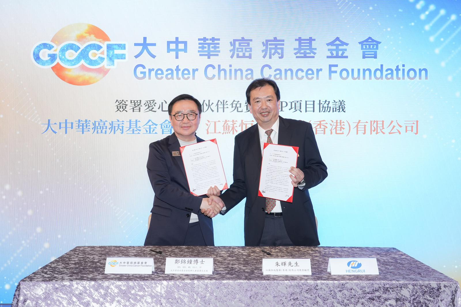鄭錦鐘主席亦與江蘇恒瑞醫藥(香港)有限公司商業顧問朱輝先生,就其自主研發藥物--「馬來酸吡咯替尼片」納入免費NPP項目簽訂協議,幫忙乳腺癌患者。