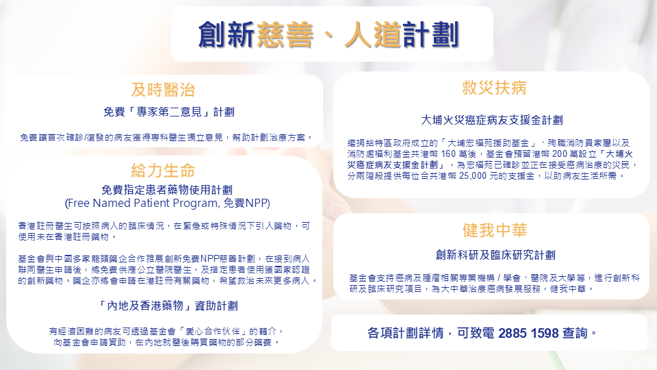 健我中華:透過中、港跨境協作,協助促成更多內地創新治癌藥物來港註冊;支持創新科研及臨床研究,服務中華民族的癌病醫療發展